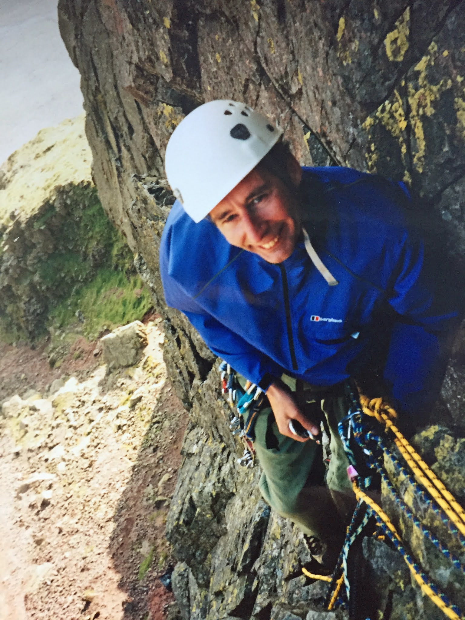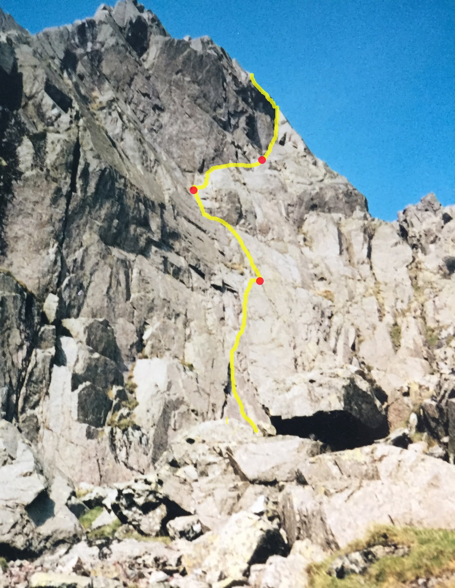 I had cams back then but they weren’t really part of my routine. It would have saved a lot of bother if they were. A couple more moves up then a long reach landed a hand round a big spike and salvation. Diagonal trending up a steady staircase led to a belay off to the right on a narrow ledge.