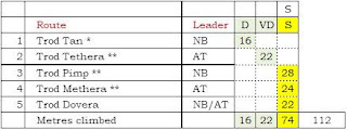 The river was well up and took some crossing with the help of a handy walking pole. No mishaps and we were up at the crag and climbing by 11.30, along with two other parties already there. What happened to the booking system?? Anyhow the they were all good company and added to the enjoyment of the day.